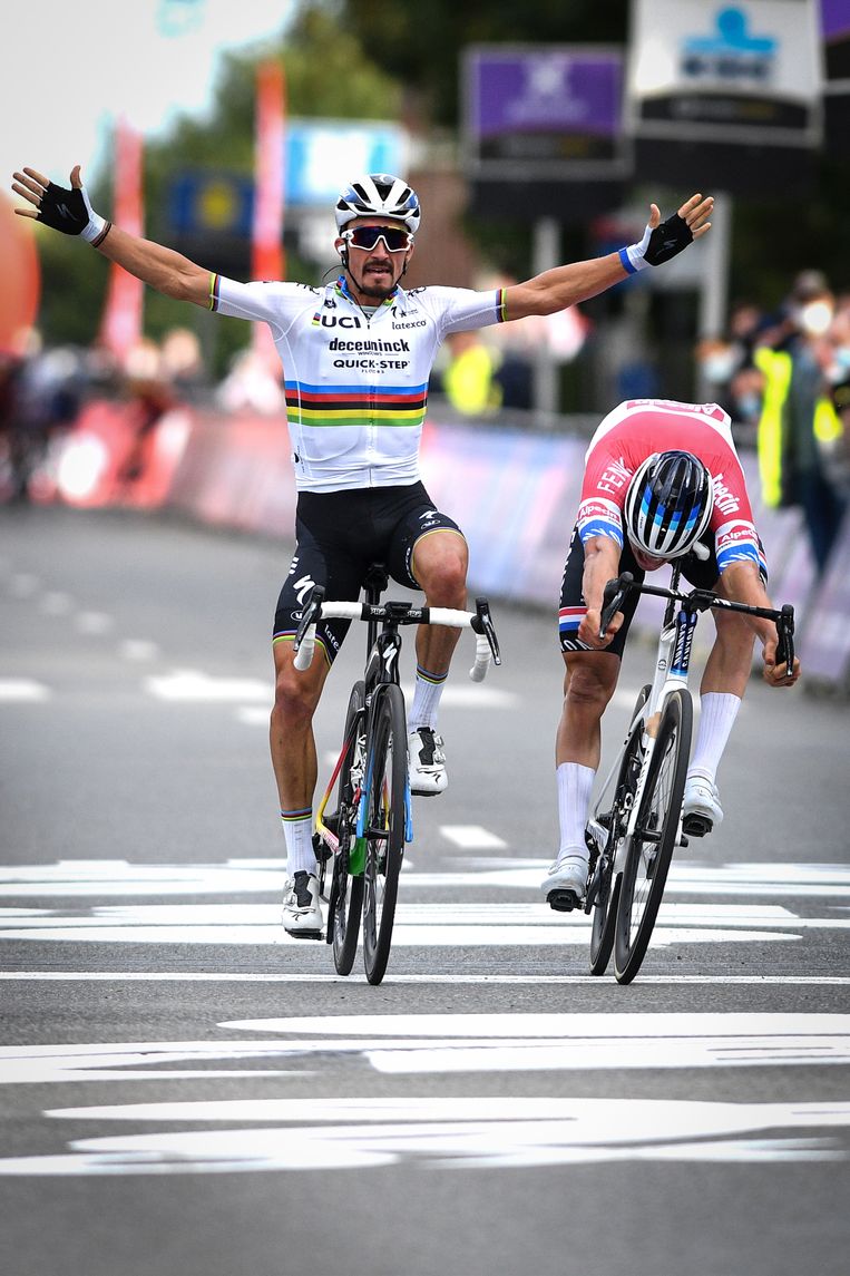 Mathieu van der poel klopte zijn grote rivaal wout van aert in een prangend sprintduel in de ronde van vlaanderen.